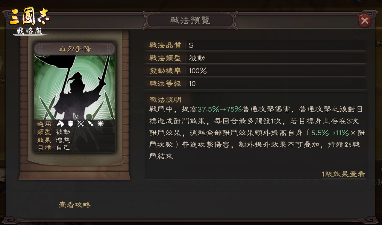 戰鬥中,提高普通攻擊傷害,普通攻擊之後對目標造成酣鬥效果,每回合最多觸發1次,標身上存在3次酣鬥效果,消耗全部效果額外提高自身普通攻擊傷害,額外提供效果不可疊加,持續到戰鬥結束